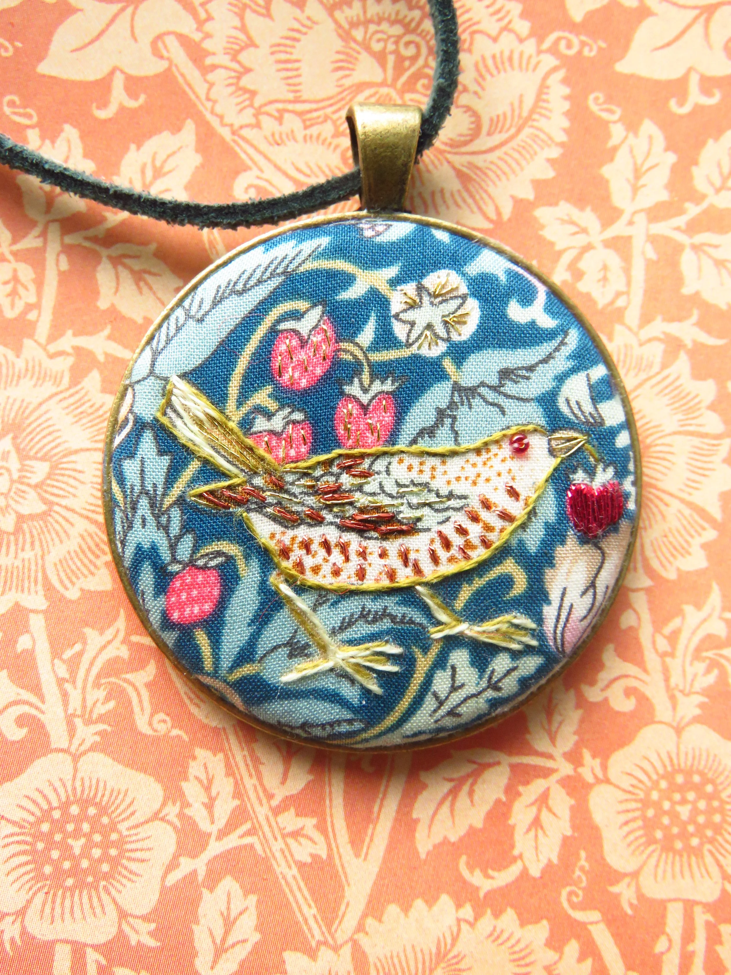 Hand embroidered pansy pendant. Stitched with silk threads on a silk backing. This beautiful pendant will be mounted in a silver colour frame with sterling silver chain.